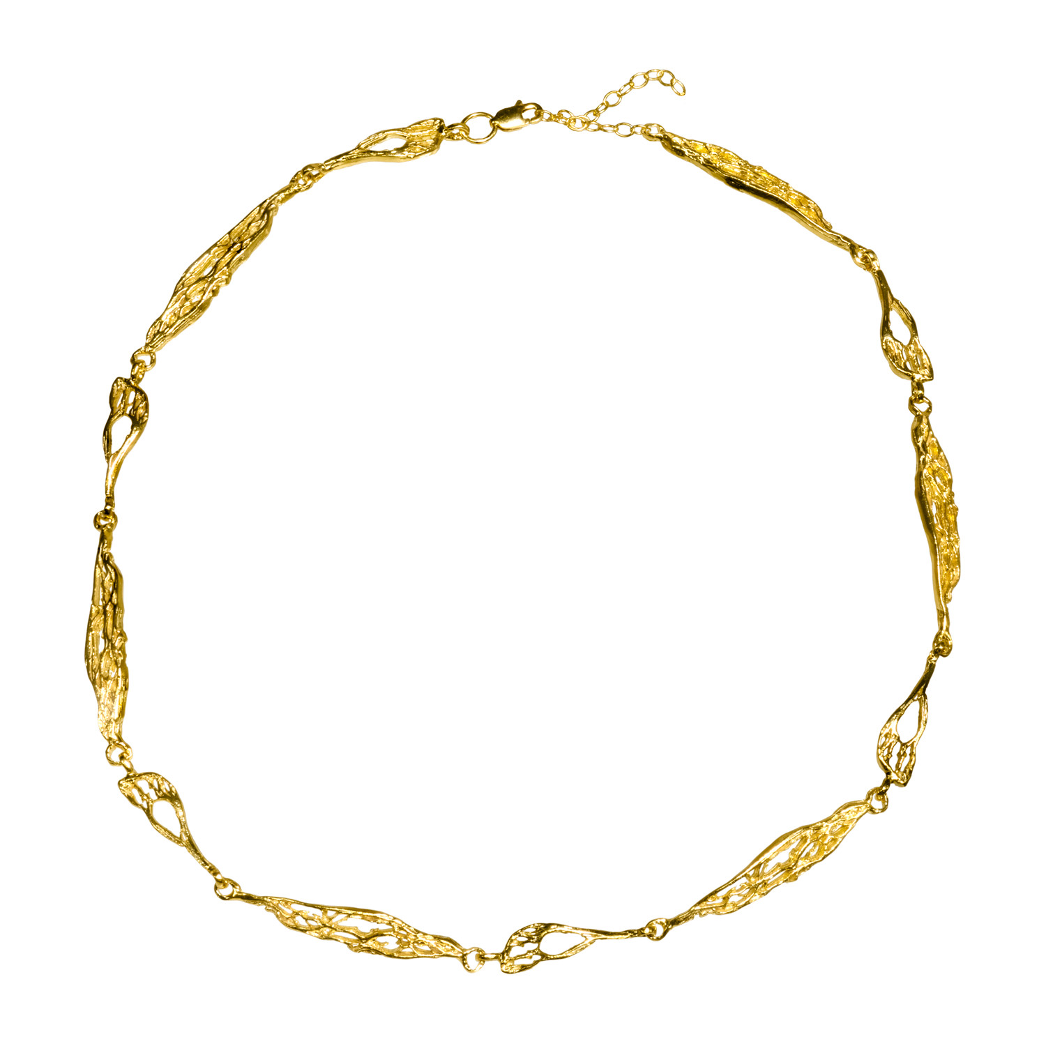 Choker περιδέραιο από την Συλλογή Αλμύρα, αποτελούμενο από αλυσιδωτές ακανόνιστες μορφές. Η οργανική του φόρμα και η διάτρητη υφή δημιουργούν ένα μοναδικό αποτέλεσμα.