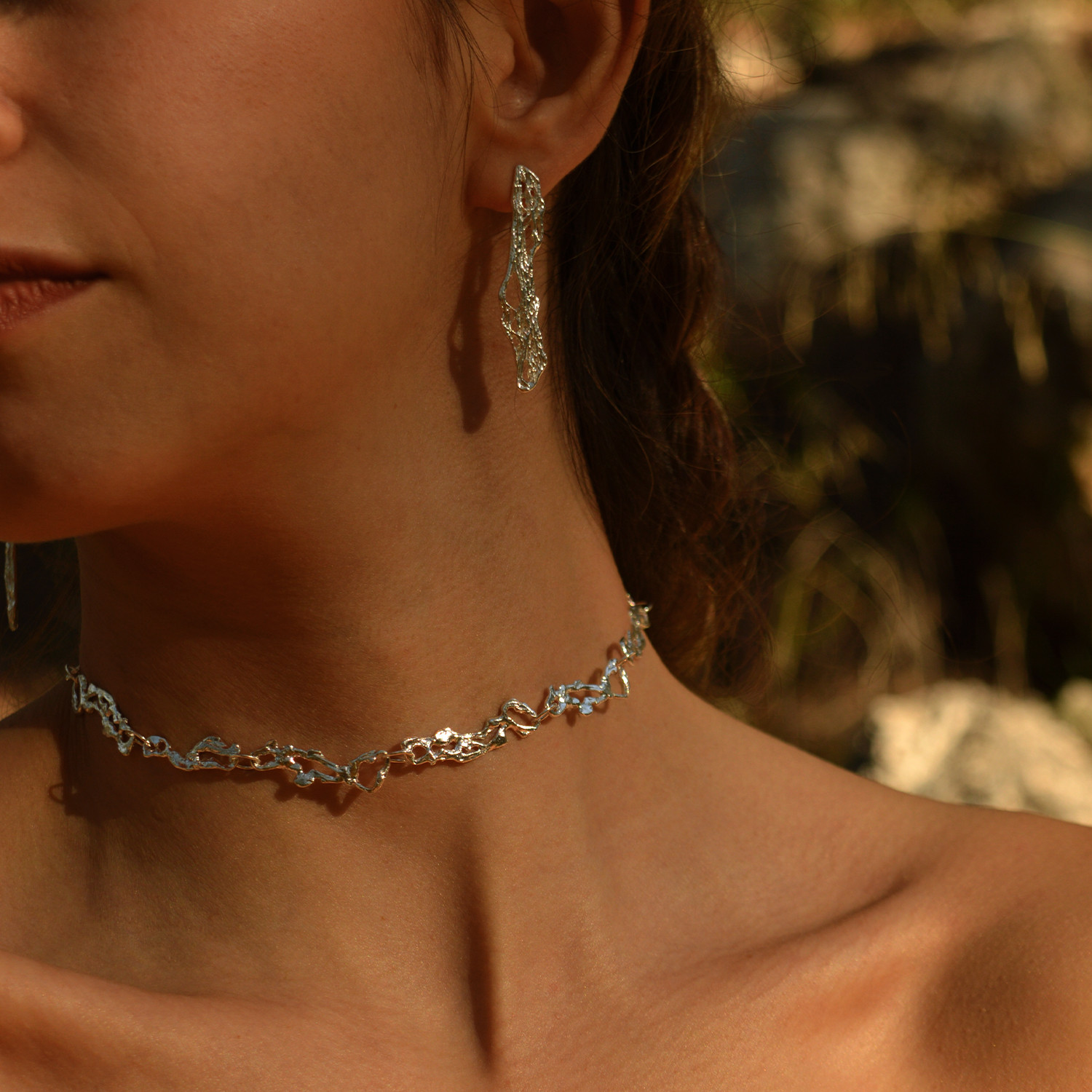 Silver choker necklace from the Ether Collection consisting of chain organic forms. The biomorphology and the natural harmony in the form gives the sensation of endless fluidity.